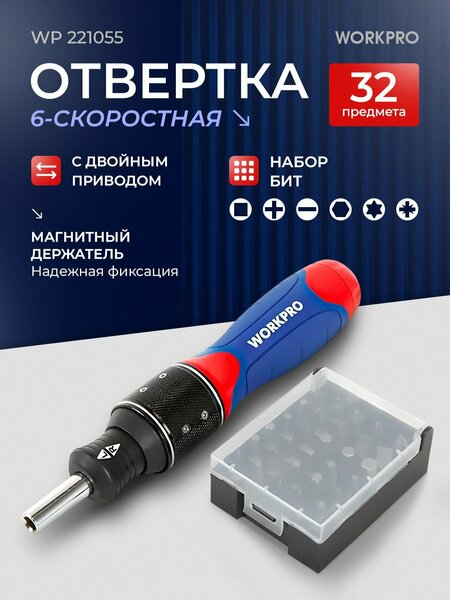 Отвертка с битами 32 шт WORKPRO WP221055. Набор бит с отверткой - это компактный и удобный инструмент для работы с различными видами крепежных элементов. Биты представляют собой небольшие насадки, которые вставляются в отвертку и позволяют работать с винтами, имеющими разные типы шлицев (плоские, крестообразные, шестигранные и т. д.). В набор входят несколько наиболее распространенных типов бит, таких как плоские, крестообразные и шестигранные, а также специальная отвертка с держателем для бит. Это позволяет быстро менять насадки и подбирать нужную для работы с конкретным типом винта. Использование набора бит с отверткой особенно удобно в тех случаях, когда нужно быстро справиться с небольшим объемом работы, например, при сборке мебели или ремонте техники. Благодаря своей компактности, такой набор можно носить с собой в кармане или сумке, что делает его идеальным выбором для выездных работ.