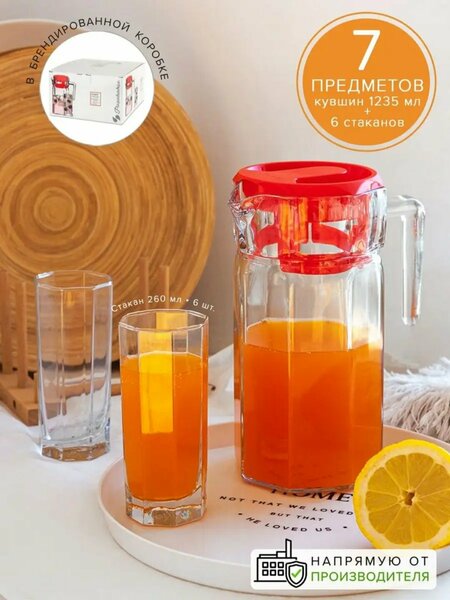Описание Набор Pasabahce "Kosem" состоит из шести стаканов и графина, выполненных из прочного натрий-кальций-силикатного стекла. Предметы набора, оснащенные рельефной многогранной поверхностью, предназначены для воды, сока и других напитков. Графин снабжен пластиковой, плотно закрывающейся крышкой. Изделия сочетают в себе элегантный дизайн и функциональность. Благодаря такому набору пить напитки будет еще вкуснее. Набор для воды Pasabahce "Kosem" прекрасно оформит праздничный стол и создаст приятную атмосферу. Такой набор также станет хорошим подарком к любому случаю. Высота графина: 24 см. Объем стакана: 200 мл. Высота стакана: 15 см.