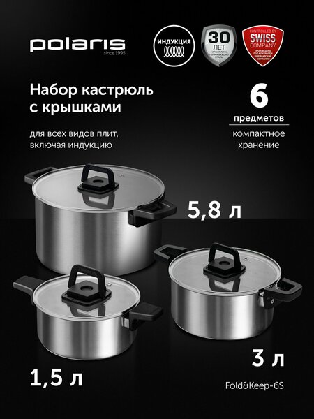Набор посуды Polaris Fold&Keep-6S - это отличное сочетание компактности, функциональности и надежности. Он будет прекрасным дополнением к любой кухне и поможет вам с легкостью приготовить самые разнообразные блюда. Набор кастрюль Fold&Keep-6S выполнен в современном минималистичном стиле и идеально сочетается с любым интерьером благодаря своему стильному и элегантному дизайну. В профессиональный комплект из 6 предметов входит: 1) Три кастрюли (маленькая 1,5 литра, средняя 3 литра и большая глубокая 5,8 литров). В каждой кастрюле присутствует мерная шкала. 2) Три прозрачные стеклянные крышки из жаропрочного стекла с эргономичными складными бакелитовыми ручками, благодаря которым хранение набора будет максимально удобным и не займет много места. Все товары Polaris производятся под строгим контролем швейцарской компании и соответствуют европейским стандартам. Посуда полностью экологична и безопасна для использования. Поварской набор выполнен из высококачественной нержавеющей стали 18/10. Изделия из нержавеющей медицинской стали 18/10 изготавливаются из сплава, состоящего из 18% хрома, который отвечает за защитный слой посуды и обеспечивает ей устойчивость к коррозии, воздействию кислот и механических повреждений. И 10% никеля, который не выделяет вредных веществ и существенно повышает нейтральность материала в отношении пищевых продуктов, что делает приготовление блюд полностью безопасным. Технология IMPAСT (тройное инкапсулированное термоаккумулирующее толстое дно с прослойкой из алюминия) обеспечивает равномерный и быстрый нагрев. Изделия из стали прослужат намного дольше, чем эмалированная и алюминиевая посуда. Подходит для варки и тушения мяса и птицы, соуса, супа, картофеля и других овощей. Посуду можно использовать на электрической, газовой, керамической и индукционной плитах. Разрешена мойка в посудомоечной машине. С набором кастрюль Поларис вы легко сможете воплотить в жизнь все кулинарные рецепты!