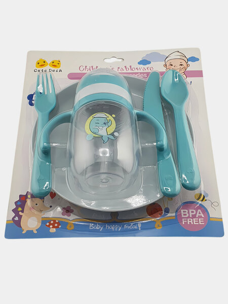 Детский набор для кормления 5 в 1 от бренда Cute Duck — это отличное решение для развития навыков самостоятельного приема пищи у вашего ребенка. Полный комплект: Этот набор включает в себя все необходимые принадлежности в одной упаковке: чашку с ручками, тарелку, ложку, вилку и детский нож. Безопасность: Продукт не содержит вредного для здоровья человека вещества Бисфенол А (BPA), поэтому он абсолютно безопасен для детей. Удобство: Посуда изготовлена из легкого, прочного и ударостойкого материала. Её можно свободно мыть в посудомоечной машине, что экономит время родителей. Дизайн: Милый дизайн с утенком и яркий голубой цвет (или другие доступные цвета) привлекут внимание вашего малыша и сделают процесс кормления еще более интересным. Подарите вашему ребенку счастливые моменты и независимость во время еды!