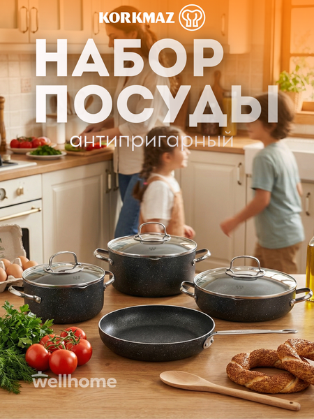 Наборы посуды KORKMAZ GALAKSI созданы для тех, кто ценит долговечность, удобство и высокое качество готовки в домашних условиях. Корпус изделий выполнен из прочного литого алюминия, обеспечивающего быстрый разогрев и равномерное распределение тепла по всей поверхности. Многослойное гранитное антипригарное покрытие нового поколения обладает повышенной стойкостью к износу, позволяет готовить с минимальным количеством масла и исключает пригорание даже при интенсивной эксплуатации. Утолщённое дно сохраняет стабильную температуру и делает набор идеальным для жарки, тушения и длительного томления блюд. Термостойкие бакелитовые ручки комфортны в использовании, не нагреваются и обеспечивают безопасный хват. Гладкая внутренняя поверхность упрощает уход и позволяет легко очищать посуду после приготовления. Набор подходит для ежедневного использования и выдерживает высокие температуры без потери свойств. Посуда совместима с газовыми и электрическими плитами, устойчива к деформации и рассчитана на долгий срок службы. Такой набор станет удобным решением как для домашней кухни, так и для профессионального использования.