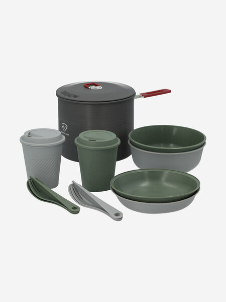 Этот набор посуды и столовых приборов для туризма идеально подходит для путешественников и любителей активного отдыха, как для мужчин, так и для женщин, предпочитающих готовить на свежем воздухе. Основным элементом набора является котелок объемом 2.5 л. Он оснащен стальной откидной ручкой в силиконовой оплетке, что обеспечивает надежный захват и защиту от ожогов. Уникальная кнопочная система фиксации ручки гарантирует ее стабильное положение во время приготовления пищи. Алюминиевая крышка котелка с отверстиями для слива воды позволяет легко сливать излишки жидкости, не снимая крышку полностью, что способствует удобству и безопасности при использовании. Комплект также включает в себя весь необходимый набор столовых принадлежностей для комфортного приема пищи на природе. 2 миски и 2 тарелки выполнены из прочных материалов, устойчивых к различным погодным условиям, что делает их идеальными для использования в походах или на пикниках. 2 кружки с крышками обеспечивают удобство при перемещении напитков и предотвращают их проливание. Столовые приборы, включая ножи, вилки и ложки, легко состегиваются между собой, что упрощает их транспортировку и хранение. Этот компактный и функциональный набор станет незаменимым спутником для 2 человек и обеспечит комфорт и уют в любом путешествии.