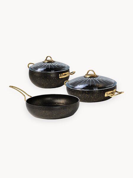 Набор посуды серии BLACK GOLD изготовлен из качественного алюминия с антипригарным 3-х слойным покрытием GIZEM FRIT. Антипригарное покрытие как с внутренней, так и с внешней стороны обеспечивает легкий уход, пища не пригорает, и посуда легко моется. Набор состоит из кастрюли с крышкой объемом 4 л, сотейника с крышкой 26 см и сковороды 26 см. Ручки всей посуды и крышек металлические, золотого цвета. Они имеют точечное соединение с алюминием заклепками. Все это обеспечивает минимальный нагрев поверхностей ручек и их надежное соединение. Крышки всех предметов набора изготовлены из прочного стекла фирмы PYREX, имеют оригинальный дизайн. Посуда серии BLACK GOLD подходит для всех типов плит, кроме индукционных. Ее можно мыть в посудомоечной машине. Набор упакован в яркую подарочную коробку.