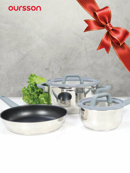 Набор посуды Oursson CS6405S/GR изготовлен из высококачественной нержавеющей стали марки AISI 304, матовая сталь внутри, зеркальная полировка снаружи. В состав набора входит кастрюля с крышкой D 24см, объемом 5,4л; ковш с крышкой D 16см, объемом 1,5л и сковорода с антипригарным покрытием D 24см. Все предметы набора имеют ударопрочное индукционное дно толщиной 4,5мм и ручки из бакелита с мягким покрытием Soft-touch. Внутри кастрюли и ковша имеются отметки литража. Крышки изготовлены из закаленного стекла с силиконовым сливным ободком. Набор посуды из нержавеющей стали — это отличное вложение в вашу кухню. Он сочетает в себе практичность, стиль и безопасность. Независимо от того, готовите ли вы для семьи или устраиваете званый ужин, такая посуда станет вашим надежным союзником на кухне. Она подходит для всех типов плит, ее можно мыть в посудомоечной машине. Набор упакован в яркую подарочную коробку.