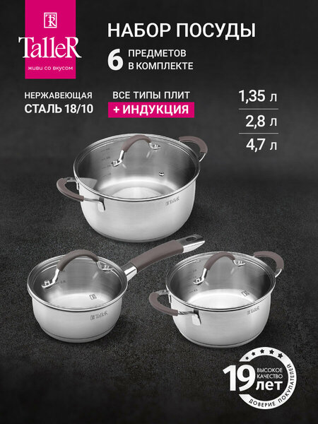 Набор посуды TalleR TR-11025 Лира Состав: ковш с крышкой 1,35 л; кастрюля с крышкой 2,8 л; кастрюля с крышкой 4,7 л. Кастрюли и ковш изготовлены из высококачественной нержавеющей стали марки 18/10. Толщина стенки - 0,5 мм, толщина дна - 4 мм. Капсулированное дно для лучшего распределения тепла. Полировка матовая внутри и снаружи. Крышки из жаропрочного стекла со стальным ободом с отверстием для выхода пара. Ручки из нержавеющей стали с силиконовыми вставками на точечной сварке. Есть отметки литража. Подходит для всех типов плит (включая индукционную). Пригоден для мытья в посудомоечной машине. Нельзя использовать в духовом шкафу.