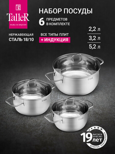 Набор посуды TalleR TR-17120 «Бригг» из нержавеющей стали 3 кастрюли Состав: кастрюля 2,2 л с крышкой 18*9 см кастрюля 3,2 л с крышкой 20*10,5 см кастрюля 5,2 л с крышкой 24*11,5 см Толщина стенки - 0,6 мм, толщина дна - 2,8 мм. Полировка матовая снаружи, зеркальная внутри. Крышки из жаропрочного стекла со стальным ободом с отверстием для выхода пара. Ручки из нержавеющей стали на сварке. Есть отметки литража. Набор посуды изготовлен из высококачественной нержавеющей стали марки 18/10: - обладает высокими антикоррозийными свойствами; - устойчив к воздействию кислот и щелочей; - не изменяет вкусовые качества, запах и цвет пищи, т. к. не вступает в реакцию с компонентами пищи. Оптимальная толщина стенок, многослойное капсулированное дно и плотно прилегающая крышка: - обеспечивает возможность приготовления пищи с минимальным количеством масла и воды; - максимально сохраняет натуральный вкус продуктов; - создает эффект «русской печки», сохраняя витамины, питательные и минеральные вещества. Капсулированное дно с алюминиевой вставкой: - обеспечивает быстрое нагревание и равномерное распределение тепла; - обладает термоаккумулирующими свойствами и сокращает время приготовления на 30%. Удобные отметки литража. Подходит для всех типов плит. Пригоден для мытья в посудомоечной машине. Рекомендации: нельзя использовать в духовом шкафу, подходит для всех типов плит (включая индукционную).