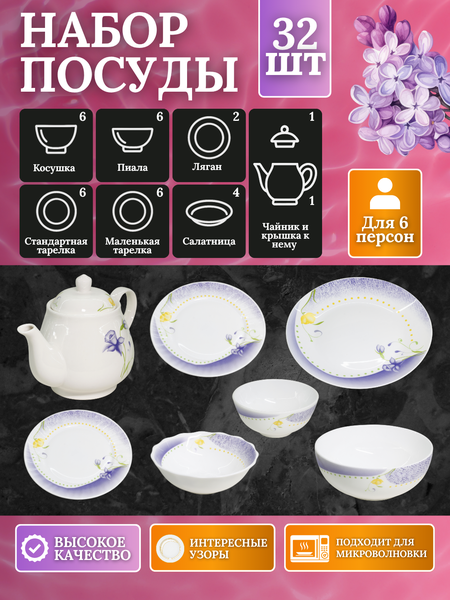 С этим набором вы забудете о проблемах с разбитой посудой и сможете наслаждаться каждым приемом пищи без лишних забот. ▎Почему стоит выбрать именно этот набор?• Невероятная прочность: Этот сервис создан, чтобы служить вам долгие годы. Удар о стол или случайное падение? Не беда! Вам придется изрядно постараться, чтобы его разбить.• Термостойкость: Переходите от холодильника к микроволновке без страха! Никаких трещин и повреждений — ваш сервис выдержит резкие перепады температур.• Гигиеничность: Гладкая структура без пор исключает накопление бактерий и неприятных запахов. Остатки еды легко смываются, обеспечивая чистоту и свежесть.• Легкость и удобство: Ультра-легкий вес делает этот набор идеальным для хранения на подвесных полках. Забудьте о тяжёлых сервизах!• Долговечность: Высокий уровень устойчивости к износу гарантирует, что ваш набор будет выглядеть как новый даже после многократного использования.▎Состав набора:• Косушки — 6 шт• Пиала — 6 шт• Тарелка (6) — 6 шт• Тарелка (7) — 6 шт• Овальные тарелки — 2 шт• Круглые салатницы — 3 шт• Лягяны для плова — 1 шт•Чайник - 1 шт▎Идеально для:• Повседневного использования в семье. • Праздничных застолий с друзьями. • Подарка близким, который будет цениться и использоваться каждый день. Не упустите шанс сделать свою кухню стильной и практичной! Закажите свой небьющийся столовый сервис уже сегодня и наслаждайтесь каждым мгновением за столом!