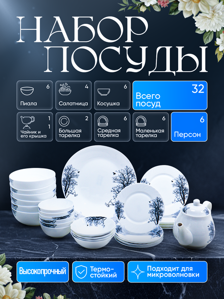 Небьющийся столовый сервис: Ваш выбор для каждой кухни! Представляем уникальный столовый сервис, изготовленный из стеклокерамики! С этим набором вы забудете о проблемах с разбитой посудой и сможете наслаждаться каждым приемом пищи без лишних забот. ▎Почему стоит выбрать именно этот набор? • Невероятная прочность: Этот сервис создан, чтобы служить вам долгие годы. Удар о стол или случайное падение? Не беда! Вам придется изрядно постараться, чтобы его разбить. • Термостойкость: Переходите от холодильника к микроволновке без страха! Никаких трещин и повреждений — ваш сервис выдержит резкие перепады температур. • Гигиеничность: Гладкая структура без пор исключает накопление бактерий и неприятных запахов. Остатки еды легко смываются, обеспечивая чистоту и свежесть. • Легкость и удобство: Ультра-легкий вес делает этот набор идеальным для хранения на подвесных полках. Забудьте о тяжёлых сервизах! • Долговечность: Высокий уровень устойчивости к износу гарантирует, что ваш набор будет выглядеть как новый даже после многократного использования. ▎Состав набора: • Косушки — 6 шт • Пиала — 6 шт • Тарелка (6) — 6 шт • Тарелка (7) — 6 шт • Круглые салатницы — 4 шт • Лягяны для плова — 2 шт •чайник - 1 шт ▎Идеально для: • Повседневного использования в семье. • Праздничных застолий с друзьями. • Подарок близким, который будет цениться и использоваться каждый день. Не упустите шанс сделать свою кухню стильной и практичной! Закажите свой небьющийся столовый сервис уже сегодня и наслаждайтесь каждым мгновением за столом