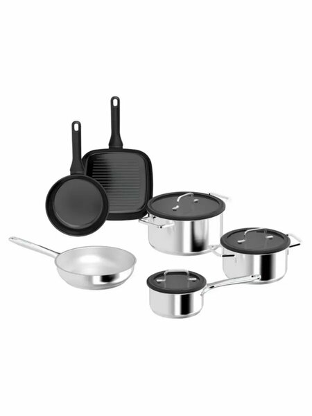 1 х ковш с крышкой, диам. 16 см, 1,5 л 1 х кастрюля с крышкой, диам. 20 см, 3,0 л 1 х кастрюля с крышкой, диам. 24 см, 5,4 л 1 х сковорода, диам. 24 см, 2,2 л 1 х сковорода с антипригарным покрытием, диам. 20 см, 1 л 1 х сковорода-гриль с антипригарным покрытием, 24 х 24 см, 1,7 л. 3-х слойное капсульное дно обеспечивает быстрый нагрев и равномерное распределение тепла; на внутренних стенках кастрюль нанесена разметка объема; стильные крышки из черного тонированного стекла со встроенным воздуховодом и функцией фильтрации; благодаря стеклянным крышкам можно следить за приготовлением блюд; подходят для всех типов плит, включая индукционные; подходят для использования в духовке; температурная устойчивость до 250°C; температурная устойчивость крышек до 180°C; легко очищаются Уход: подходят для мытья в посудомоечной машине