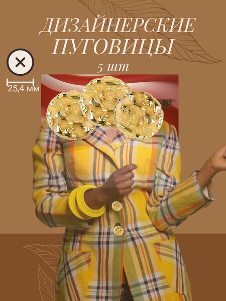 Набор декоративных золотистых пуговиц премиум класса из 5 штук станет ярким акцентом на жакетах, пиджаках, костюмах. Кроме того, дизайнерские золотые металлические пуговицы могут быть использованы и на меховой одежде. Они открывают множество возможностей для украшения одежды, аксессуаров и предметов интерьера, придавая им особый шарм и индивидуальность. Товары есть в наличии в магазине Marido, вы можете сделать заказ напрямую.