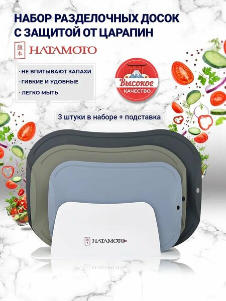Набор из 4 кухонных аксессуаров: Большая разделочная доска 398х274х2,5 мм (темно-серая) Средняя разделочная доска 345х237х2,5 мм (хаки) Маленькая разделочная доска 287х198х2,4 мм (голубая) Подставка для разделочных досок Кухонные разделочные доски Хатамото NON-SCRATCH имеют антибактериальное покрытие и изготовлены из современных материалов, соответствующих стандартам FDA и SGS, и не содержат вредного вещества BPA, которое обычно присутствует в пластиковой посуде. Разделочная доска Хатамото NON-SCRATCH облажает несколькими дополнительными преимуществами. Во-первых, не впитывают запахи, что важно, так как обычные пластиковые доски могут стать источником загрязнения и неприятных запахов из-за следов царапин. Во-вторых, не скользят и, самое главное, не оставляют царапин. Это полезно, так как царапины на досках могут привести к забиванию пищи и неприятному запаху. При нарезке окрашивающих продуктов, таких как свекла, морковь и другие, мытье агрессивными средствами для мытья посуды, содержащие хлор, на разделочных досках могут оставлять пятна. Специальные полости вдоль доски предотвращают вытекание жидкостей за край, так что рабочая поверхность будет в чистоте. Благодаря удобной ручке, не придётся затрудняться при снятии доски с рабочей поверхности. Она станет прекрасным дополнением профессиональным ножам на вашей кухне. Уход за доской NON-SCRATCH донельзя прост: достаточно промыть моющими средствами, не содержащими хлор и фосфаты. Рекомендуется использовать наборы разного цвета для каждого вида продуктов. Предлагаем купить разделочную доску Hatamoto NON-SCRATCH для себя или сделать актуальный подарок для близкого вам человека.