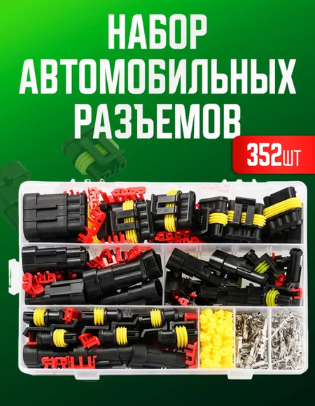 Набор разъемов автомобильных 352 предмета. Влагозащищенный электр. коннектор для машины в боксе. 1/2/3/4 pin, 26 комплектов. Разъем автомобильный влагозащитный. Герметичная колодка с проводом на 1/2/3/4 контакта (1/2/3/4 pin). Обеспечивает надежное соединение и защиту от коррозии и влаги. Герметичные разъемы 1, 2, 3, 4-pin поставляются в разобранном виде и служат для подключения доп. приборов, соединения проводов в местах воздействия влаги и грязи. Набор включает 352 детали влагозащищенных разъемов. Высокая герметичность достигается за счет силиконовых уплотнителей, сам разъем выполнен по типу Superseal. Разъемы используются в автомобилестроении для подключения фар и организации разъемных соединений с высокой грязе-влаго защитой. Спецификация:* Материалы: пластик* Размер: 20*13,8*3,8 см* Подходит для: автомобилей, мотоциклов, грузовиков, автофургонов, лодок и других морских транспортных средств* Напряжение: 300 В, Номинальный ток: 12А* Количество pin-ов: 1/2/3/4* Рабочая темпераНабор разъемов автомобильных 352 предмета. Влагозащищенный электр. коннектор для машины в боксе. 1/2/3/4 pin, 26 комплектов. Разъем автомобильный влагозащитный. Герметичная колодка с проводом на 1/2/3/4 контакта (1/2/3/4 pin). Обеспечивает надежное соединение и защиту от коррозии и влаги. Герметичные разъемы 1, 2, 3, 4-pin поставляются в разобранном виде и служат для подключения доп. приборов, соединения проводов в местах воздействия влаги и грязи. Набор включает 352 детали влагозащищенных разъемов. Высокая герметичность достигается за счет силиконовых уплотнителей, сам разъем выполнен по типу Superseal. Разъемы используются в автомобилестроении для подключения фар и организации разъемных соединений с высокой грязе-влаго защитой. Спецификация: * Материалы: пластик * Размер: 20*13,8*3,8 см * Подходит для: автомобилей, мотоциклов, грузовиков, автофургонов, лодок и других морских транспортных средств * Напряжение: 300 В, Номинальный ток: 12А * Количество pin-ов: 1/2/3/4 * Рабочая температура: -25 ~ 85 градусов * Водонепроницаемость: IP67 Комплектация: 1 контакт: (8 комплектов) 8+8 разъемов корпуса клеммы папа+мама, 8+8 колпачков контактов корпуса клеммы папа+мама, 8+8 штырьков клеммы папа+мама, 16 силиконовых водонепроницаемых штепсельных вилок; 2 контакта: (6 комплектов) 6+6 разъемов корпуса клеммы папа+мама, 6+6 колпачков контактов корпуса клеммы папа+мама, 12+12 штырьков клеммы папа+мама, 24 силиконовых водонепроницаемых штепсельных вилки; 3 контакта: (6 комплектов) 6+6 разъемов корпуса клеммы папа+мама, 6+6 колпачков контактов корпуса клеммы папа+мама, 18+18 штырьков клеммы папа+мама, 36 силиконовых водонепроницаемых штепсельных вилок; 4 контакта: (6 комплектов) 6+6 разъемов корпуса клеммы папа+мама, 6+6 колпачков контактов корпуса клеммы папа-мама, 24+24 штырьков клеммы папа+мама, 48 силиконовых водонепроницаемых штепсельных вилок;