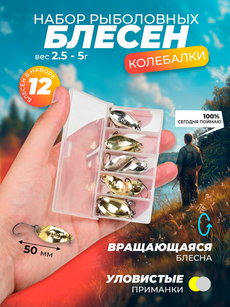 В нашем комплекте рыболовных аксессуаров вы найдете 12 штук колебалок, которые станут незаменимым помощником на любом водоеме. Уловистые приманки предназначены для твичинга и подходят для ловли щуки, окуня, жереха, голавля, язя, судака и многих других видов рыб. Набор для рыбалки подарочный включает приманки из прочной нержавеющей стали, длина которых составляет 50 мм. Благодаря их точному подражанию мелким рыбкам, они станут незаменимыми помощниками на рыбалке. Комплект подходит как для летней, так и для зимней рыбалки. Универсальные блесны можно использовать с различными видами снастей: спиннингами и удочками. Уловистые приманки хорошо работают на разных типах водоемов и являются отличным выбором как для профессионалов, так и для любителей. Комплект характеризуется высокой износостойкостью благодаря использованию качественных материалов. Блесны отлично играют в воде, привлекая внимание хищных рыб. Вращающаяся блесна особенно эффективна при активном ужении. Переходите в наш магазин, чтобы выбрать другие товары и аксессуары для рыбалки и обновить свою рыболовную амуницию.