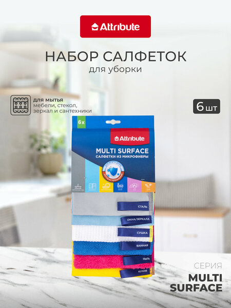 Набор салфеток из микрофибры для уборки Attribute Multi Surface, 6 штук