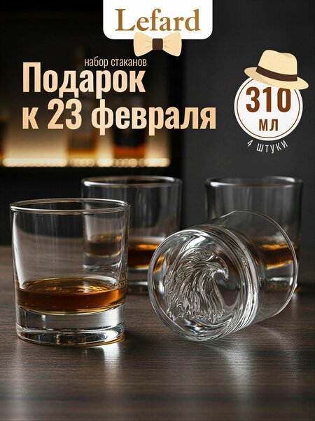 Набор стаканов для виски Lefard "EAGLE", 4 шт, 310 мл, стеклянные — это стильный и функциональный аксессуар, который станет частью вашей кухни. Высококачественное стекло, используемое в этих стаканах, не впитывает запахи и не влияет на вкус напитка, обеспечивая комфортное использование и простоту в уходе. Стаканы имеют вместимость 310 мл. Они выполнены из прочного стекла, которое отличается элегантностью и утонченностью, что делает их универсальными для любого интерьера. Бесцветное стекло идеально подходит для акцентирования внимания на содержимом, а фактурный узор и гравировка добавляют особый шарм. Эти стаканы предназначены для подчёркивания эстетики употребления виски и других крепких напитков. Они идеально подходят как для домашней сервировки, так и для использования в баре. Возможность мытья в посудомоечной машине облегчает уход за стеклянной посудой, что особенно актуально при частом использовании. Комплект включает четыре стеклянных стакана, каждый из которых упакован в подарочную упаковку, что делает его отличным подарком для любителей виски и стильных аксессуаров.
