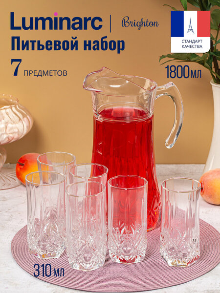 Питьевой набор Luminarc BRIGHTON - это набор из 7 предметов, который станет незаменимым помощником на вашем столе. Набор изготовлен из высококачественного стекла, что гарантирует его долговечность и безопасность использования. Бесцветный материал позволяет сохранить прозрачность и чистоту воды, сока или вина, а также придает набору элегантный вид. Благодаря объему в 1.8 литра, каждый из предметов набора способен вместить достаточное количество напитка для большой компании. Особое внимание стоит уделить возможности мытья набора в посудомоечной машине. Это значительно упрощает процесс ухода за ним и экономит ваше время. В целом, питьевой набор Luminarc BRIGHTON - это стильный, функциональный и практичный выбор для тех, кто ценит качество и удобство.