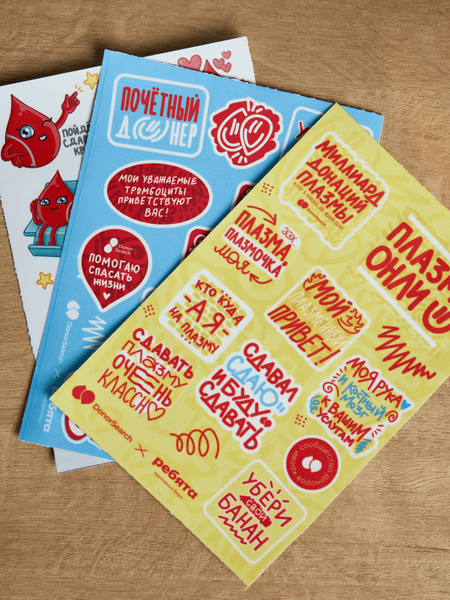 Стикерпак DonorSearch — это не просто набор наклеек. Это знак вашей доброй воли. Каждая наклейка — это отметка о вашем добром поступке, о вашей донации, о принадлежности к самому отзывчивому сообществу, которое ежедневно спасает тысячи жизней. Ваш пример способен вдохновить других! Не стесняйтесь заявить о себе и своей миссии. Меняйте мир к лучшему. Что входит в набор? Это три стикерпака — три листа формата А5, на которых вас ждёт более 30 уникальных дизайнов! На каждом листе расположено от 10 до 12 ярких и стильных наклеек. Станьте амбассадором донорского движения! Используйте стикеры в календаре или планере, наклейте на телефон, ноутбук или термос. Они обязательно привлекут внимание и станут отличным поводом рассказать друзьям и коллегам о донациях. Помогите нам привлечь новых членов сообщества и несите добро в массы. Качество, которому можно доверять. Стикерпаки изготовлены из высококачественных материалов, что обеспечивает их долговечность. Наклейки устойчивы к внешним воздействиям: не стираются и не выгорают на солнце, надолго сохраняя свой безупречный вид.