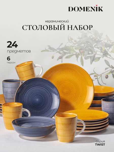 Набор столовой посуды Domenik TWIST: стиль и функциональность Столовый сервиз Domenik TWIST представляет собой набор из 24 предметов, рассчитанный на 6 персон. В комплект входят все необходимые элементы для сервировки стола: обеденные, суповые и десертные тарелки, а также кружки. Посуда изготовлена из керамики, что гарантирует ее прочность и долговечность. Благодаря этому, набор станет отличным выбором для ежедневного использования и будет радовать вас своим внешним видом на протяжении долгого времени. Сервиз Domenik TWIST подходит для мытья в посудомоечной машине и использования в СВЧ-печи. Это значительно упрощает процесс ухода за посудой и делает ее использование еще более комфортным. Дизайн набора выполнен в нейтральных синих и желтых тонах, что позволяет ему гармонично вписаться в любой интерьер кухни. Отсутствие узора делает его подходящим для любого стиля и настроения. Производство сервиза осуществляется в Китае, что гарантирует его доступность и отличное качество. Выбирая набор столовой посуды Domenik TWIST, вы получаете стильный, функциональный и качественный столовый сервиз, который станет незаменимым помощником на вашей кухне.