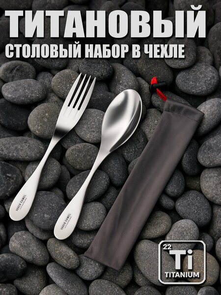 Комплект столовых приборов из титана. Имеют слегка вытянутую, округлую форму и полированную поверхность. По размеру приборы ближе к десертным ложке и вилке. Ложка: длина 180 мм. Ширина максим(черпало) 35 мм, ширина максимальная в районе ручки(держало) 21 мм. Вес ложки 28 г. Вилка: длина 180 мм. Ширина в районе зубчиков 25 мм, ширина максимальная в районе ручки (держало) 21 мм. Вес 22 г. Каждый предмет упакован в тканевый чехол с утяжкой на клипсе. Также каждый из предметов набора можно приобрести по отдельности.