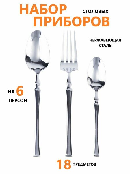 Набор столовых приборов 18 предметов на 6 персон. Столовые приборы набор: ложки столовые - 6шт, вилки столовые - 6шт, ложки чайные - 6шт. Набор столовых предметов выполнен из высококачественной нержавеющей стали, очень прочные, не гнутся, имеют длительный срок службы, отлично сохраняют эксплуатационные свойства. Пищевая нержавеющая сталь не имеет запаха и сохраняет вкус и аромат продуктов натуральными. Приборы для кухни с выпуклостью в симметричном формате и тщательно закругленными краями, обеспечивающими больший комфорт в использовании. Утонченные, привлекательные изогнутые линии приборов объединяют в себе отличную эргономику и изысканный внешний вид. Дизайн воссоздан по всем канонам стиля, не подвластному времени и моде. Глянцевая отделка. Набор посуды столовой подходит на каждый день и для праздничной сервировки стола. Их можно мыть ежедневно в посудомоечной машине. Приборы столовые вилки ложки в комплекте. Набор столовых приборов. Коллекция ресторанных ложек и вилок, которые станут прекрасным дополнением к Вашей кухне и создадут особую атмосферу за столом.