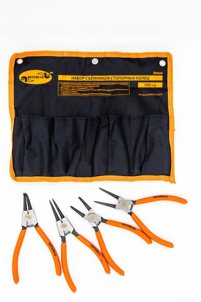 Набор съемников 180мм стопорных колец 4пр.(АвтоDело) Применяется для снятия и установки внутренних и наружных стопорных колец. В комплекте четыре съёмника с прямой и изогнутой конструкцией захвата. L - 180мм. Изготовлены методом холодной штамповки. Материал - хром-ванадиевая сталь. Пластиковые защитные рукоятки. Покрытие - фосфатирование. Упаковка - сумка.