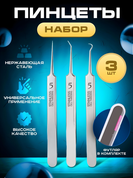 Набор сверхтонких пинцетов из 3 штук (прямой острый, изогнутый 45 градусов, изогнутый 125 градусов). Универсальный, может быть использован для ремонтных работ, сборочного производства (часов, микроэлектроники), декоративно-прикладной работы, ювелирного дела, для творчества, в косметологии (наращивания ресниц, чистка лица). Зажимы пинцеты изготовлены из нержавеющей стали, устойчивы к коррозии, обладают термостойкими свойствами. Длина пинцетов - 11,5 см. Толщина наконечника - 0,01 мм. В комплект входит футляр для хранения.