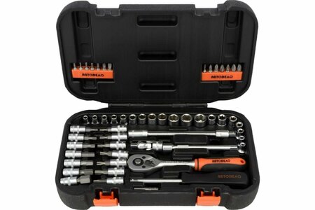 6-гранные: 4, 4,5, 5, 5,5, 6, 7, 8, 9, 10, 11, 12, 13 мм; Torx: Е4, Е5, Е6, Е7, Е8, Е10 со вставками: Т10, Т15, Т20, Т25, Т27, Т30, Т40; Hex: 3, 4, 5, 6, 7, 8, 10 мм; трещотка 150 мм, удлинитель гибкий 150 мм, удлинитель прямой 100 мм, рукоятка-удлинитель 150 мм, кардан шарнирный 42 мм