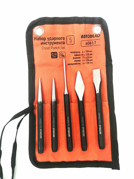 Набор ударного инструмента АвтоDело 5 предметов Набор ударного инструмента АвтоDело предназначен для общих долбежных и демонтажных работ с материалами различной степени твердости. Набор укомплектован самыми распространенными ударными инструментами применяемыми при ремонте автомобиля и в быту. Инструмент закалён до твёрдости 54-58 HRC.
