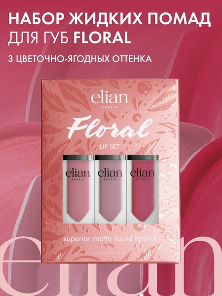 Набор жидких матовых помад для губ Superior Matte от российского производителя косметики Elian Russia обволакивает губы нежной, насыщенной вуалью цвета, которая при высыхании образует матовое покрытие. Помада имеет жидкую нелипкую стойкую текстуру, которая удобно наносится, долго держится, не высушивает кожу, не растекается и не скатывается. Выразительный, глубокий оттенок подчеркивает форму губ, придает им сочность и яркость. Губная помада содержит богатую витаминном E формулу, питающую и увлажняющую губы, помогая защитить кожу от агрессивных внешних факторов на протяжении всего дня, даря ощущение комфорта. Аппликатор позволяет добиться прорисовки точных контуров без использования карандаша. Подходит для повседневного и профессионального макияжа. Drama Lip Set оттенки: глубокий терракотовый, голливудский красный и классический винный. Nude Lip Set оттенки: пыльно-розовый, теплый бежевый и нежно-ягодный. Floral Lip Set оттенки: классический розовый, нежный лавандовый и малиновый.