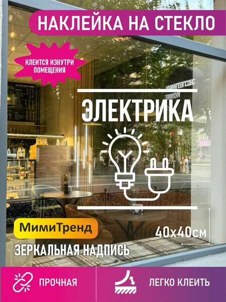Зеркальная наклейка электрика. Открываете магазин электрики? Большая наклейка 40х40 см электрики на окна вам идеально подойдет. Незаменимый декор. Наши наклейки изготовлены из прочного белого винила Oracal европейского качества. В наборе наклейка 1 штука, на прозрачной монтажной пленке для легкого монтажа наклейки. Легко крепить. Предназначена как для наружного, так и внутреннего применения. Можно нанести при входе. Высокое качество пленки позволяет клеить стикер на любую поверхность. Держится в течение длительного срока, не боится влаги, пыли и грязи. Просто наклеить, легко снять. Переходите в профиль, там вы найдете другие наклейки и баннера для вашего бизнеса.