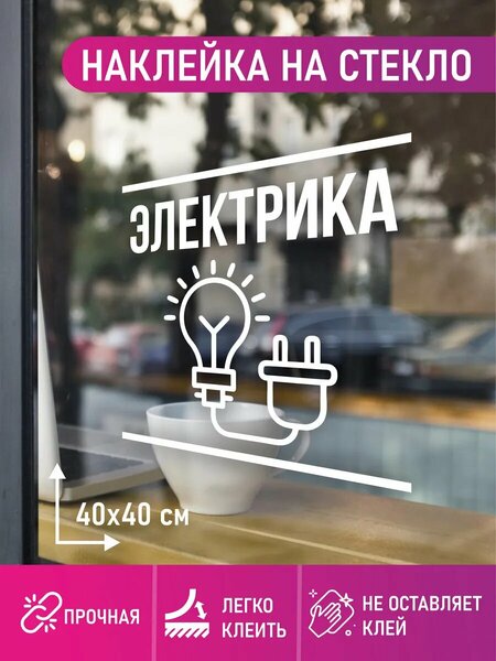наклейка электрика. Открываете магазин электрики? Большая наклейка 40х40 см электрики на окна вам идеально подойдет. Незаменимый декор. Наши наклейки изготовлены из прочного белого винила Oracal европейского качества. В наборе наклейка 1 штука, на прозрачной монтажной пленке для легкого монтажа наклейки. Легко крепить. Предназначена как для наружного, так и внутреннего применения. Можно нанести при входе. Высокое качество пленки позволяет клеить стикер на любую поверхность. Держится в течение длительного срока, не боится влаги, пыли и грязи. Просто наклеить, легко снять. Переходите в профиль, там вы найдете другие наклейки и баннера для вашего бизнеса.