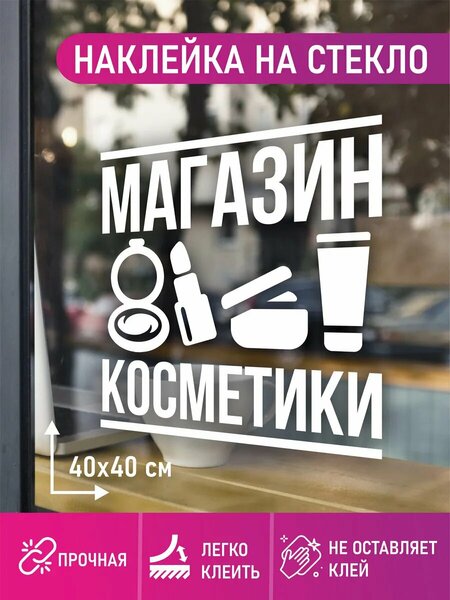 У нас вы можете купить пленку наклейка на окно "магазин косметики". Размер 40х 40 см. Пленка предназначена как для наружного, так и внутреннего применения! Видеоинструкция легко поможет вам наклеить! Можно наклеить при в ходе в кабинет косметолога или салон красоты, наклеить на улице. Высокое качество немецкой пленки ПВХ позволяет клеить стикер на любую поверхность. Наклейке можно придумать и другое применение. Держится в течение длительного срока. Просто наклеить, легко снять. Стикер держится долго и не боится влаги, пыли и грязи. Подойдет для вашего бизнеса, салона, кабинета