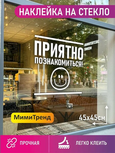Наклейка приятно познакомиться. Открываете пекарню или магазин продуктов? Большая наклейка 45 на 45 см кофе и выпечка на окна вам идеально подойдет. Так же есть в профиле для вас баннеры -вывески для вашй пекарни или кофейни или магазина продуктов. Незаменимый декор. Наши наклейки изготовлены из прочного белого винила Oracal европейского качества. В наборе наклейка 1 штука, на прозрачной монтажной пленке для легкого монтажа наклейки. Легко крепить. Предназначена как для наружного, так и внутреннего применения. Можно нанести при входе. Высокое качество пленки позволяет клеить стикер на любую поверхность. Держится в течение длительного срока, не боится влаги, пыли и грязи. Просто наклеить, легко снять. Переходите в профиль, там вы найдете другие наклейки и баннера для вашего бизнеса.