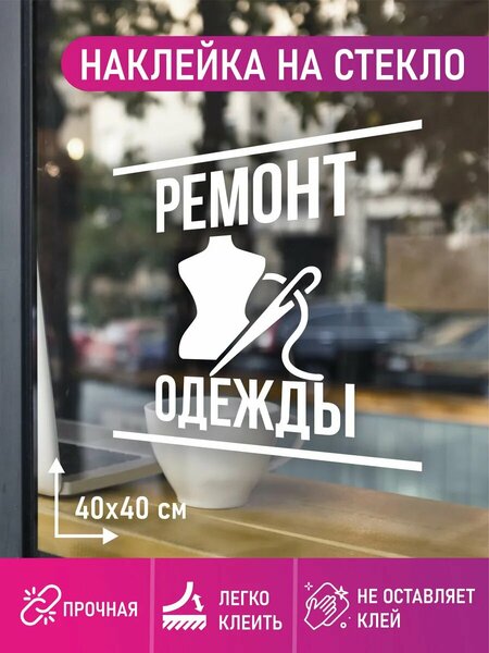 Наклейка "ремонт одежды". Открываете Ателье и не знаете как привлечь внимание прохожих? Наклейка 50х50см см ателье на окна вам идеально подойдет. Так же есть в профиле для вас баннеры -вывески для вашего бизнеса. Незаменимый декор. Наши наклейки изготовлены из прочного белого винила Oracal европейского качества. В наборе наклейка 1 штука, на прозрачной монтажной пленке для легкого монтажа наклейки. Легко крепить. Предназначена как для наружного, так и внутреннего применения. Можно нанести при входе. Высокое качество пленки позволяет клеить стикер на любую поверхность. Держится в течение длительного срока, не боится влаги, пыли и грязи. Просто наклеить, легко снять. Переходите в профиль, там вы найдете другие наклейки и баннера для вашего бизнеса.