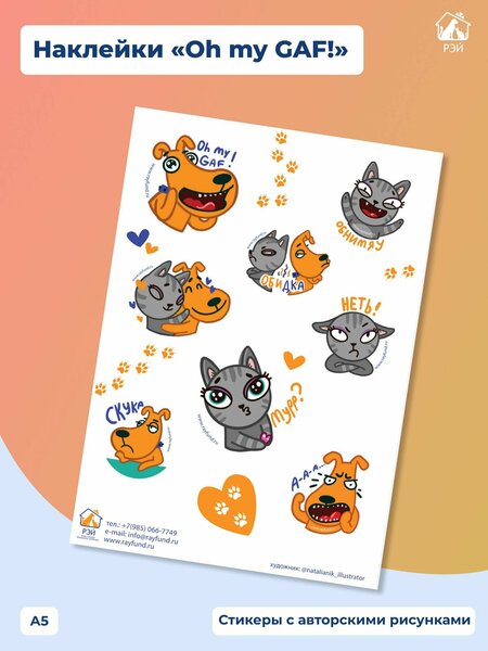 Стикеры с авторскими рисунками от фонда «РЭЙ» добавят индивидуальности вашему ноутбуку, ежедневнику или любой другой поверхности. На одном листе формата А5 – 8 наклеек. Данный товар представлен благотворительным фондом «РЭЙ». Фонд помогает бездомным животным и поддерживает более 40 приютов: привозит корма и лекарства, оказывает помощь в лечении животных, перевозит питомцев из приютов на первом в России бесплатном зоотакси. Также фонд проводит много мероприятий, которые посвящены дружбе животных и людей, и обучает детей и взрослых относиться к животным грамотно и ответственно. Покупая товары от благотворительного фонда «РЭЙ» вы помогаете животным, оставшимся на улице, обрести дом, а зачастую – и новую семью. Вся прибыль от продаж будет перечислена напрямую в фонд «РЭЙ».