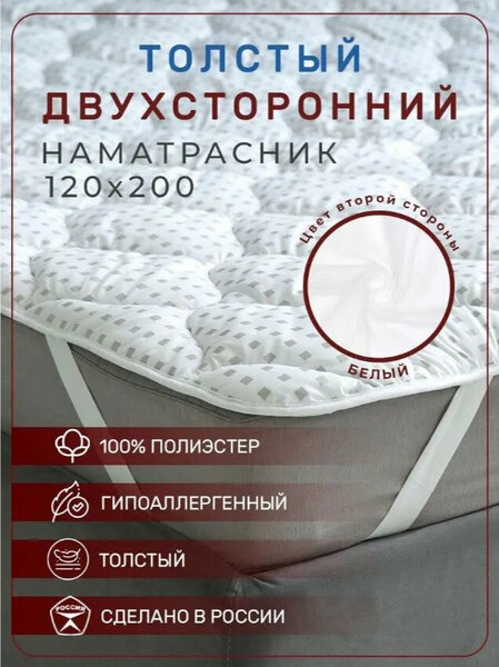 Стеганый наматрасник, изготовлен из мягкого материала микрофибра. Главная функция – защита матраса от пыли, пятен и механических повреждений, увеличивая срок службы матраса. Не шуршит, не скользит, тем самым не доставляя неудобств во время сна. Пропускает воздух, не накапливает запахи, приятен на ощупь, не электризуется. Такой матрасник идеально подходит как для детей, так и для взрослых. Двухсторонний чехол дает возможность пользоваться любой стороной изделия и наслаждаться здоровым сном. Усиленный бортик по периметру топпера придает дополнительную прочность и эстетичный внешний вид. Наполнитель, собственного производства Холлотерм - аналог лебяжьего пуха плотностью 230 г/м2, равномерно распределяется по всей рабочей площади изделия, не сбиваясь в комки и сохраняя местоположение на протяжении всего срока службы. По свойствам схож с натуральным материалом, однако имеет значительные преимущества: гипоаллергенный, долговечный, быстро сохнет, сохраняет форму после частых стирок. За счет крупной стежки у наполнителя больше пространства для распушивания. Матрасник становится объемный и воздушный, придает дополнительную мягкость, помогает сгладить небольшие неровности на матрасе. Удобные и толстые резинки 4 см по углам хорошо тянутся до высоты матраса 30 см и надежно фиксируют защитный топер во избежание смещения под матрасника с поверхности матраса, а также позволяют легко и быстро закрепить намотрасник на матрасе. Вы можете быть уверены, что топер останется на месте даже при активных движениях во время сна. Имеет стильный принт, который подойдет для любого интерьера и станет модным дополнением вашей спальни. Чехол подходит для двуспальных (2 спальных), кроватей, а также для диванов и кушеток. Для того чтобы определить, какой размер топпера подходит именно Вам, следует измерить ширину и длину спального места по крайним точкам. Параметры матраса и обычного матрасника должны максимально совпадать. Рекомендуемая стирка при температуре не выше 30 градусов. Накладку можно стирать в стиральной машине. Не требует глажки. Производится на современном оборудовании в России. Мы гарантируем качество, долговечность и надежность нашего домашнего текстиля!