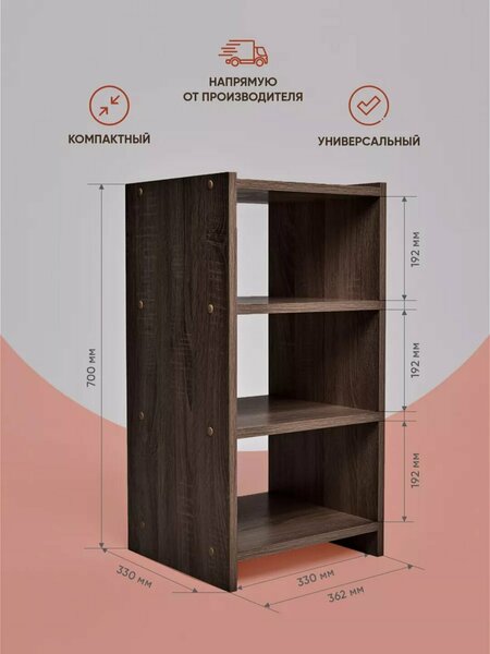 Представляем Вам тумбу стеллаж от производителя. Благодаря своему современному и простому дизайну наше изделие впишется практически в любой стиль Вашего интерьера, а также в любое помещение дома, квартиры, офиса. Она идеально подходит для хранения разных мелочей, имеет компактные размеры, что позволяет использовать ее даже в небольших помещениях. Стеллаж выполнена из экологически чистого ЛДСП и состоит из 4 секций полочек закрепленных между собой , без ящиков, дверей и ножек. Сборка простая и занимает около 15 минут в среднем. Мебель доставляется в хорошо упакованной картонной коробке, защищенной от повреждений и сколов. Фурнитура для сборки и инструкция по сборке входят в комплект. Приятного Вам пользования!
