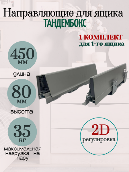 андембокс-это механизм выдвижного ящика с системой полного выдвижения, которая обеспечивает свободный обзор и доступ ко всем уголкам ящика. TANDEMBOX длиной 450 мм и высотой 80мм обеспечивают плавный ход, высокий комфорт движения. Высококачественное изделие, которое можно устанавливать в кухонный гарнитур любого класса. Ящики с металлическими стенками и доводчиком оборудованы направляющими с синхронизаторами, способными выдержать нагрузку до 35 килограмм. Для удобства покупателей они поставляются в индивидуальной упаковке, в которой находится все для сборки комплекта и понятная инструкция. Фурнитура является надежной и эффективной благодаря особому механизму направляющих tandembox. Эти ящики станут незаменимыми помощниками в установке ящиков для любой мебели. С металлическими стенками и доводчиком, они не только функциональны, но и прочны. При этом они легко выдерживают нужную нагрузку без лишних усилий. Это идеальное решение для ящиков на кухне или в ванной комнате, для комодов в спальне или прихожей, в детской комнате. Не теряйте времени на выбор - эти ящики точно подойдут для вашей мебели. Они помогут наполнить пространство порядком и комфортом.