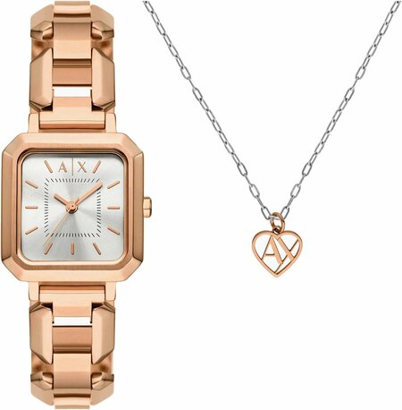Женские часы. Коллекция Leila. Женские кварцевые часы. Квадратный стальной корпус. Циферблат выполнен по технологии Sunray (солнечные лучи) и украшен накладным логотипом бренда. Метки в виде штрихов. Граненая заводная головка. Стальной браслет с раскладывающейся застежкой. В комплекте цепь с подвеской в виде сердца с монограммой AX. Тип механизма: кварцевый. Корпус: сталь с розовым IP покрытием. Циферблат: серебристый. Браслет: стальной с розовым IP покрытием. Водозащита: 50WR. Стекло: минеральное. Габаритные размеры: 27х27мм.