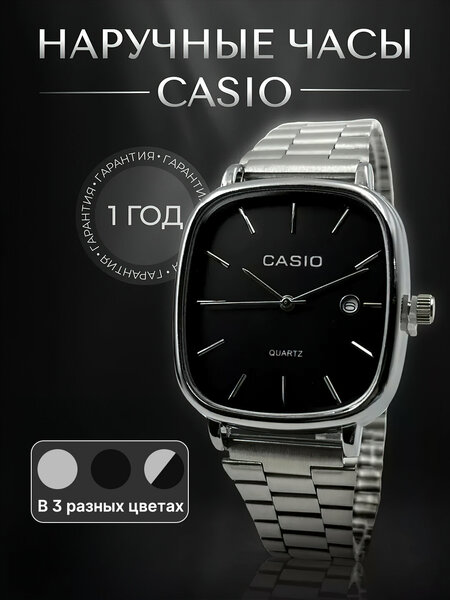 Элегантные кварцевые часы Casio с квадратным корпусом, черным циферблатом и металлическим браслетом. Идеально подойдут для делового и повседневного стиля.
