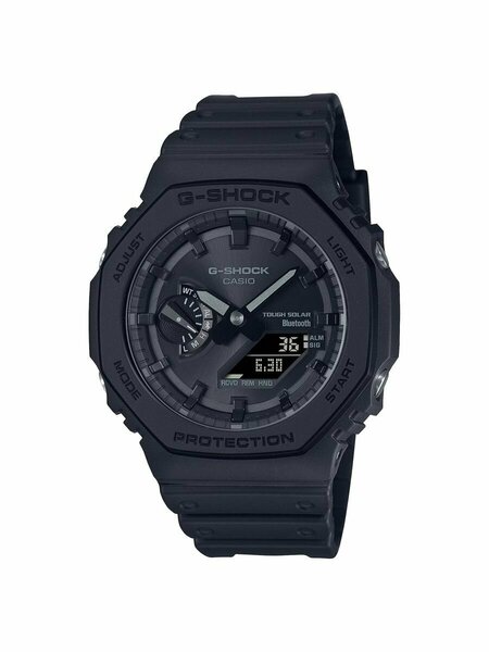 Перед вами долгожданное обновление мая 2022 года в одном из самых популярных корпусов G-Shock последних лет. Стильная модель в октагоновом корпусе из серии GA-B2100 сохранила внешний облик своих предшественников по серии GA-2100, но получила более технологичный модуль с блютус синхронизацией со смартфоном и солнечной батареей на борту. В остальном модель по-прежнему отличается от других джишоков своей легкостью, компактностью и толщиной корпуса всего в 11.9 мм, что стало возможным благодаря технологии Carbon Core Guard: модуль часов защищает легкий и сверх-прочный полиуретановый корпус с углеродным армированием, а циферблат покрыт закаленным минеральным стеклом. Часы выполнены в минималистичном дизайне, а контрастные стрелки, на фоне черного циферблата с инверсионным дисплеем, обеспечивают высокую эргономику при пользовании часами. Еще одна особенность часов — удобное крепление ремешка, теперь его смена займет у вас всего несколько секунд. Конечно же, не стоит забывать про стандартную для джишоков водозащиту в 200 метров, функции секундомера, таймера, мирового времени, удобную функцию складывания стрелок для считывания информации с дисплеев, а также яркую двойную подсветку циферблата и дисплея.