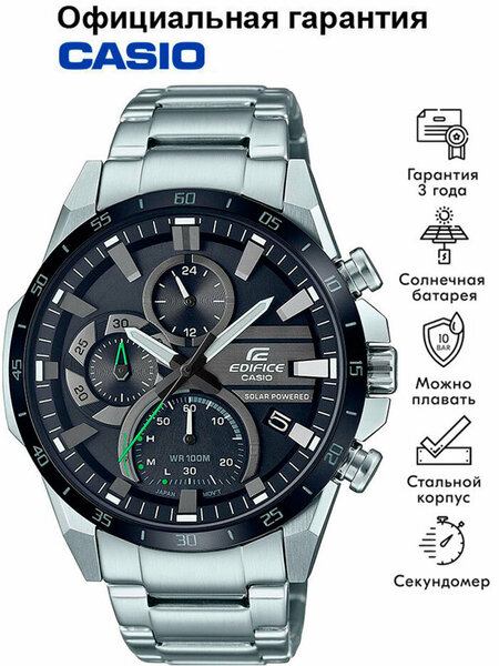 Мужские кварцевые наручные часы с хронографом (секундомером) Casio EQS-940DB-1A на солнечной батарее. Коллекция Edifice. Калибр механизма — 5585. Срок работы аккумулятора с полным зарядом — около 5-ти месяцев. Примерный срок службы аккумулятора — 10 лет. Присутствует функция информирования о недостаточном заряде и индикатор степени заряда аккумулятора. На данной модели отображается дата и время суток (24 часа). Секундомер может отсчитывать до 29 минут 59 секунд с шагом 1 сек. Стрелки и метки покрыты люминесцентным напылением (светятся в темноте). Стальной браслет. На корпус частично нанесено стойкое PVD покрытие. Завинчивающаяся задняя крышка. Водонепроницаемость WR100 (10 атм). Размеры корпуса: (ШхВхТ) 45.5x49.5x12.5 мм. Гарантийный срок — 3 года (1 год от производителя + 2 года от магазина).