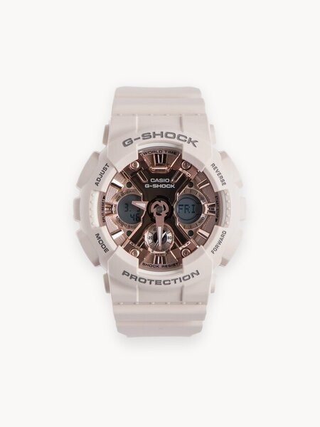 Японские женские часы. Коллекция G-SHOCK. G-SHOCK S SERIES - это серия унисексовых и женских джишоков, имеющих меньший размер корпуса, в отличие от остальных часов G-SHOCK, что позволяет им оптимально выглядеть даже на женских запястьях. Тип механизма: кварцевый. Корпус: пластик. Циферблат: розовый. Браслет: пластиковый. Водозащита: 200WR. Подсветка: светодиодная. Звуковой сигнал: 5 будильников, один с функцией Snooze, ежечасный сигнал. Стекло: минеральное. Календарь: автоматический: число, день недели, месяц (до 2099г). Габаритные размеры: 49x45,9мм, толщина 15,8мм, вес 55г.