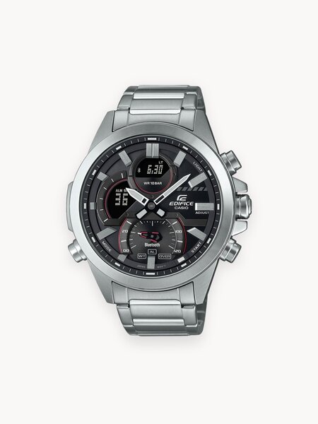 Японские мужские часы. Коллекция Edifice. Добро пожаловать в эволюцию Speed & Intelligence - высокотехнологичная красота стального хронографа EDIFICE с брутальным видом и удобным подключением к смартфону. Эта модель позволяет легко синхронизироваться со смартфоном через Bluetooth® и подключаться к приложению Casio Watches для полной функциональности под сенсорным управлением. Приложение обеспечивает точный отсчет времени без нажатия кнопок, когда ваш телефон находится рядом. Таймер расписания, разработанный для удовлетворения потребностей гоночных команд, синхронизируется с приложением календаря вашего смартфона для передачи элементов расписания на телефон и отображения времени начала и окончания на ЖК-дисплее часов. Цифро-аналоговый циферблат с крупными метками, дополнительными циферблатами и элементом в форме моста выполнен в смелом дизайне. Часы оснащены светодиодной подсветкой, которая загорается при простом наклоне запястья. Вдохновленный спорткарами дизайн механического циферблата увеличивает глубину и объем, чтобы передать динамичный облик, силу и надежность этих высокопроизводительных автомобилей. Созданный в стиле спидометра дополнительный циферблат на 6 часов еще больше усиливает концепцию дизайна спортивного автомобиля. С новинкой Edifice вы получаете не просто аксессуар, а настоящий многофункциональный гаджет, который станет верным помощником для современного мужчины. Тип механизма: кварцевый. Калибр: Casio 5686. Корпус: сталь. Циферблат: черный. Браслет: стальной. Водозащита: 100WR. Подсветка: Neobrite, светодиодная. Звуковой сигнал: 5 будильников, ежечасный сигнал. Стекло: минеральное. Календарь: автоматический: число, день недели, месяц (до 2099г). Габаритные размеры: 48,7x52,3мм, толщина 12,9мм, вес 148г. Технические особенности: Элемент питания CR2016.