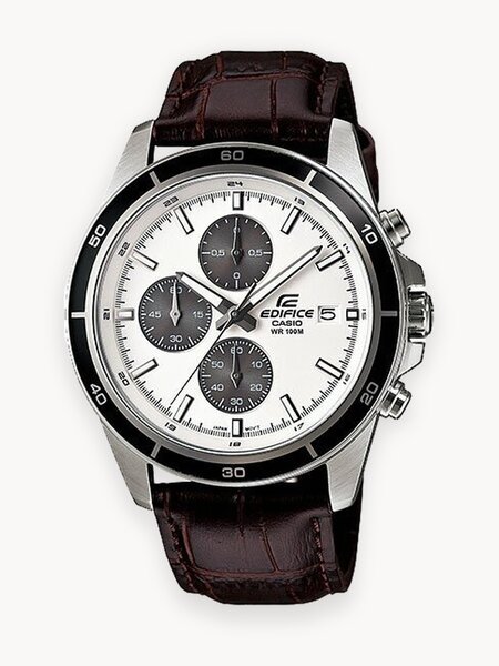 Японские мужские часы. Коллекция Edifice. Edifice. Часы-хронограф. Стальной круглый корпус. Безель с минутной шкалой. Метки в виде штрихов. Окошко даты находится в положении 3 часа. Заостренные прямоугольные стрелки в стиле Baton. Заводная головка с защитой. Задняя крышка с винтовым фиксатором. Раскладывающаяся застежка, расстегиваемая одним касанием.• Секундомер с точностью показаний 1/10с и временем измерения 1ч.• 12-ти и 24-х часовой формат времени.• SPLIT-хронограф.• Батарейка рассчитана на 2 года. Тип механизма: кварцевый. Корпус: сталь. Циферблат: белый. Браслет: кожаный ремешок. Водозащита: 100WR. Стекло: минеральное. Календарь: число. Габаритные размеры: 43,8х48,5мм, толщина 11,6мм, вес 74г.
