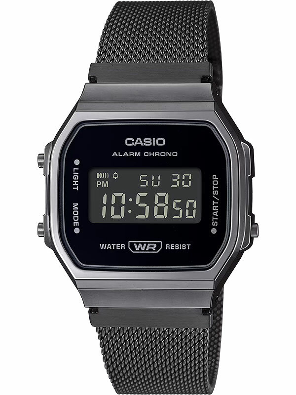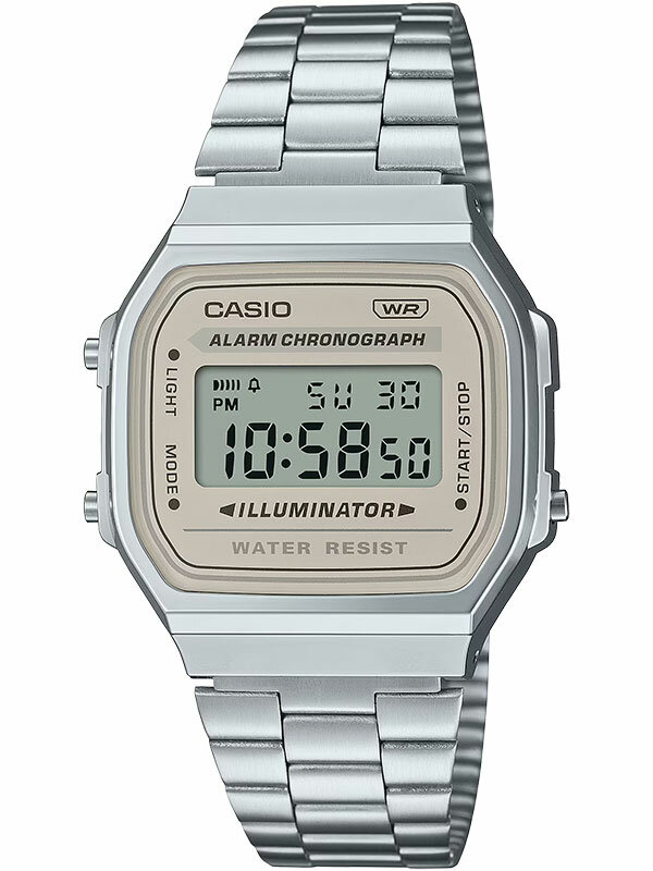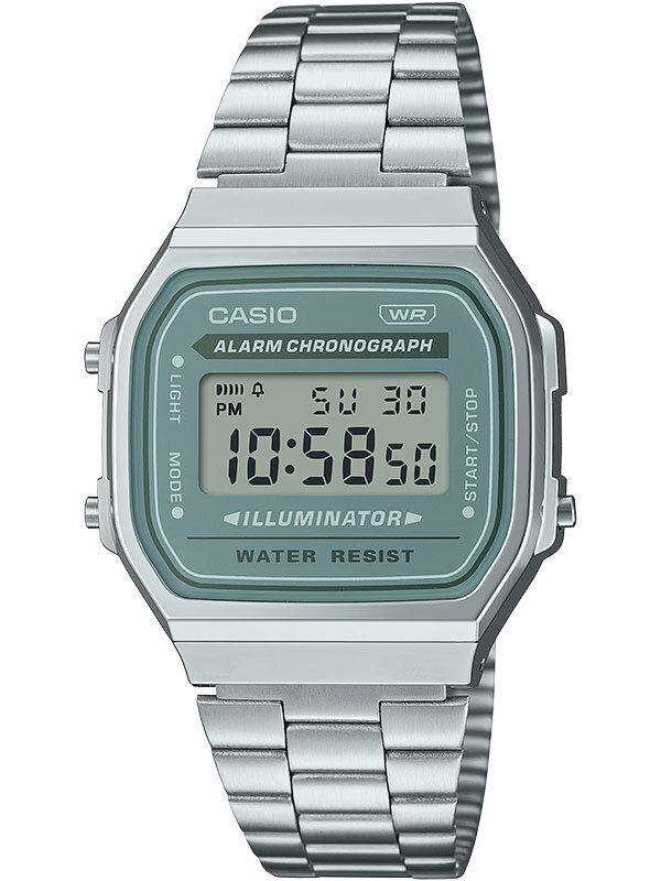 Электронные кварцевые наручные часы Casio Vintage A168WA-8A с цифровой индикацией времени. Калибр механизма — 3298. Функциональность данной модели: формат времени 12/24, автоматический календарь с установкой 28 дней на февраль, будильник, сигнал начала часа, секундомер с точностью 1/100 секунды и измерением до 59 минут 59,99 cек, электролюминесцентная подсветка циферблата. Стальной браслет. Водонепроницаемость WR (3 атм). Размеры корпуса: (ШxВxТ) 36.3x38.6x9.6 мм. Гарантийный срок — 3 года (1 год от производителя + 2 года от магазина).