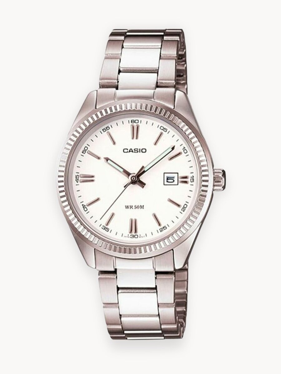 Женские наручные часы Casio LTP-1302D-7A1 кварцевые, работающие от батарейки. Корпус из латуни с белым циферблатом и минеральным стеклом, защищающим циферблат от ударов и повреждений, браслет стальной. Модель Casio LTP-1302D-7A1 обладает степенью влагостойкости 50 м (5 АТМ), в этом случае разрешено кратковременное погружение в воду, для плавания рассмотрите модели от 100 м (10 АТМ). Циферблат подсвечивается необритовой подсветкой (Neobrite) - комбинацией светодиодной и люминесцентной подсветки, разработанной корпорацией Casio и примененной в моделях серии G-Shock.
