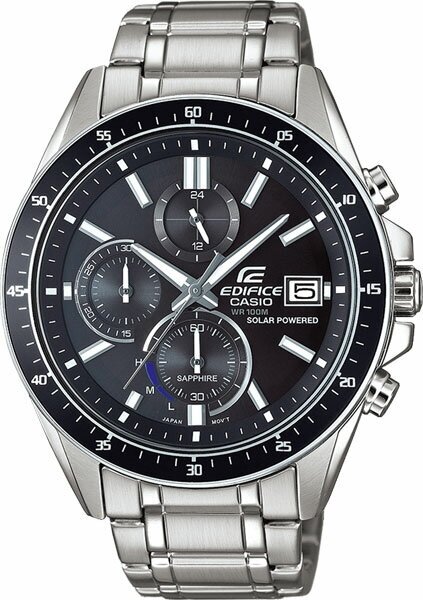 Японские мужские часы. Коллекция Edifice. Спортивные часы-хронографы с питанием от световой энергии. На циферблате имеется индикатор запас хода. Светонакопительное покрытие позволяет видеть время в темноте даже после непродолжительного нахождения часов на свету. Подойдут как для повседневной, так и для активной деятельности. Тип механизма: кварцевый. Корпус: сталь с частичным IP покрытием. Циферблат: черный. Браслет: стальной. Водозащита: 100WR. Подсветка: Neobrite. Стекло: сапфировое. Календарь: число. Габаритные размеры: 52х46,1мм, толщина 11,8 мм, вес 159г.