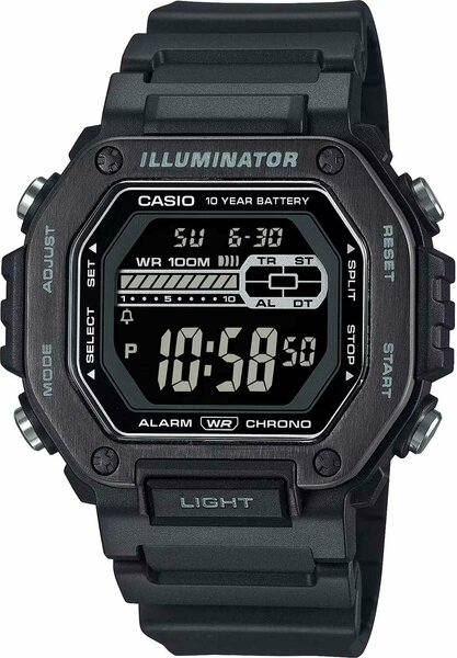 Японские мужские часы. Коллекция Collection. Отличный вариант недорогих часов, которые оснащены стандартным набором функций для занятий спортом. Тип механизма: кварцевый. Корпус: пластик со стальными вставками с IP покрытием. Циферблат: ЖК черный. Браслет: пластиковый. Водозащита: 100WR. Подсветка: светодиодная. Звуковой сигнал: будильник, ежечасный сигнал. Стекло: пластиковое. Календарь: автоматический: число, день недели, месяц (до 2099г). Габаритные размеры: 47,2x50,8мм, толщина 12,3мм, вес 50г.