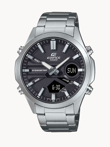 Японские мужские часы. Коллекция Edifice. Самый практичный аксессуар, который никогда не подведет вас в вопросах времени. Тип механизма: кварцевый. Корпус: сталь. Циферблат: черный. Браслет: стальной. Водозащита: 100WR. Звуковой сигнал: 3 будильника, один с функцией Snooze, ежечасный сигнал. Стекло: минеральное. Календарь: автоматический: число, день недели, месяц (до 2099г). Габаритные размеры: 45,5х49,5мм, толщина 13,7мм, вес 141г.